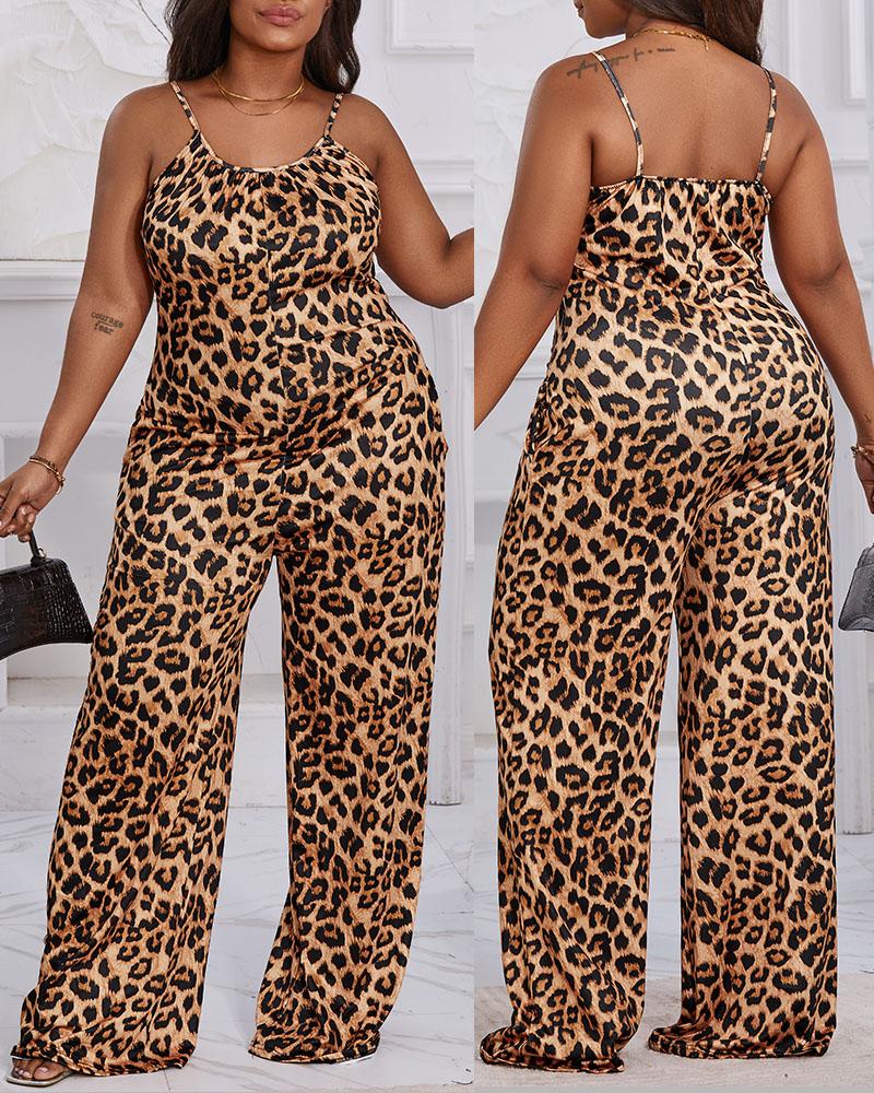 Plus Size Leopard Print Spaghetti Strap Jumpsuit