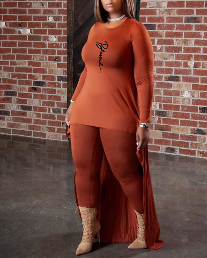 Plus Size Letter Pattern Dip Hem Top & Pants Set, Orange