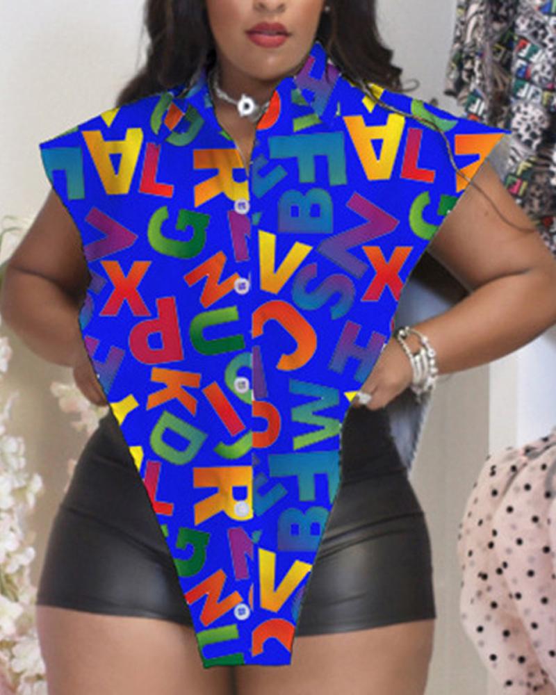 Plus Size Letter Print Split Hem Button Down Shirt, Blue