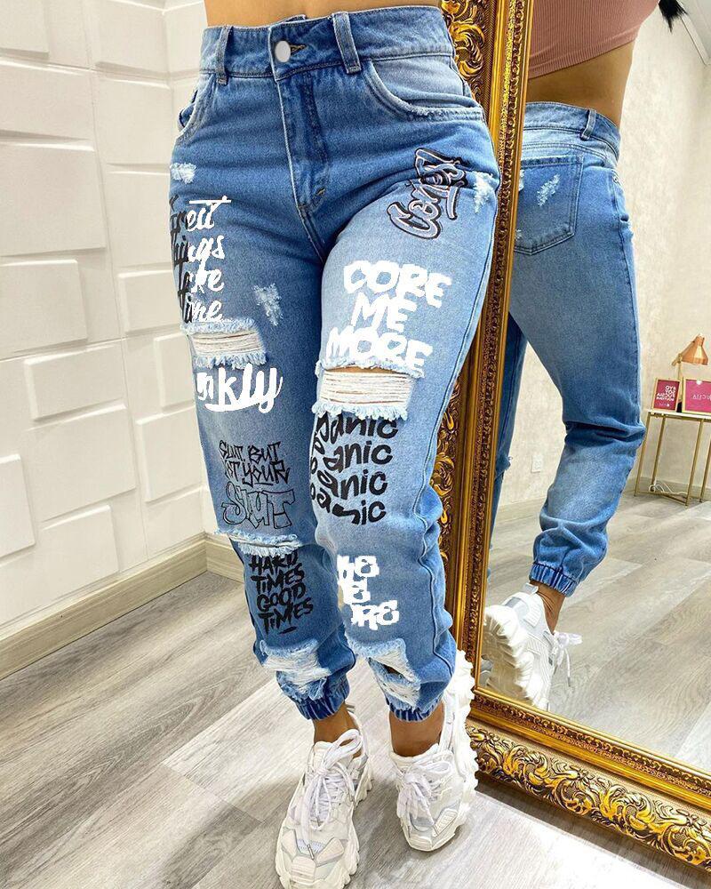 Plus Size Letter Print Zipper Fly Ripped Skinny Jeans, Blue