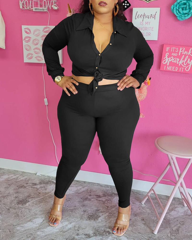Plus Size Long Sleeve Button Design Top & Pants Set, Black