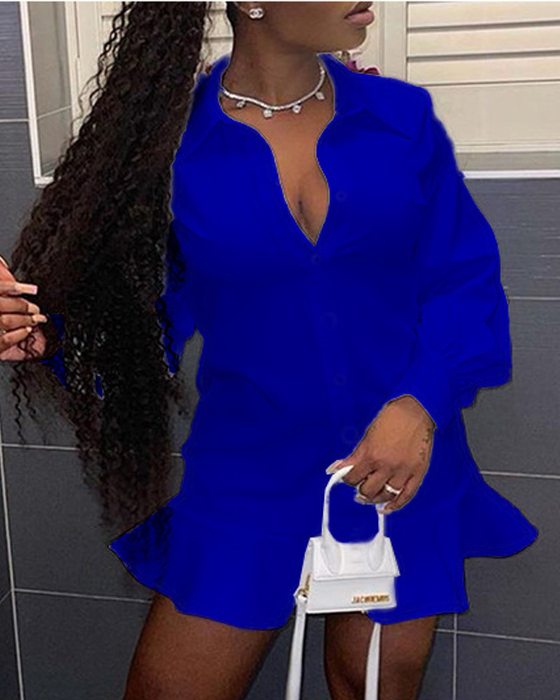 Plus Size Long Sleeve Button Front Ruffle Hem Shirt Dress, Blue