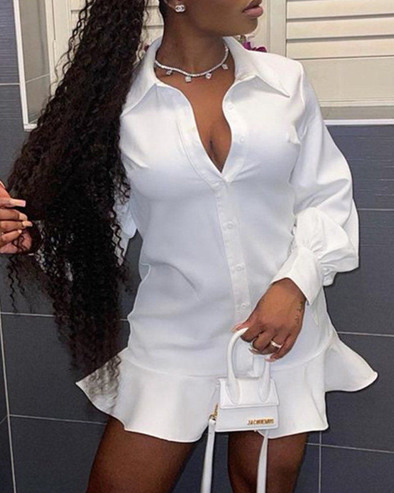 Plus Size Long Sleeve Button Front Ruffle Hem Shirt Dress, White