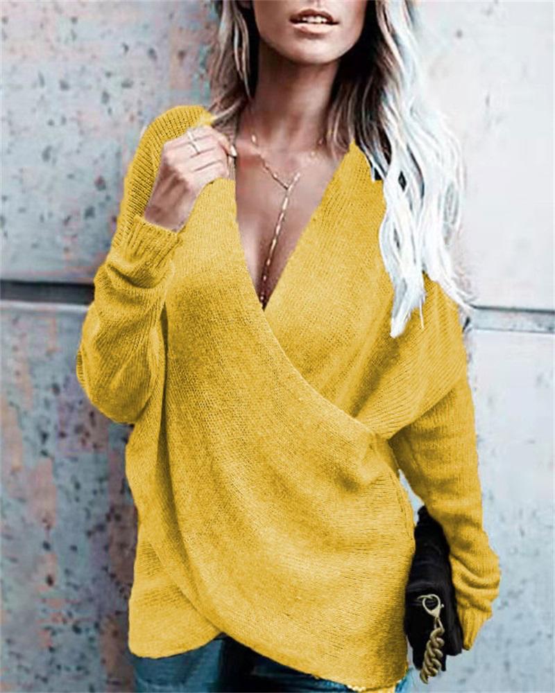 Plus Size Long Sleeve Crisscross V-Neck Sweater, Yellow