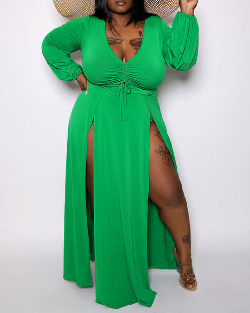 Plus Size Long Sleeve Drawstring Ruched High Slit Maxi Dress, Green