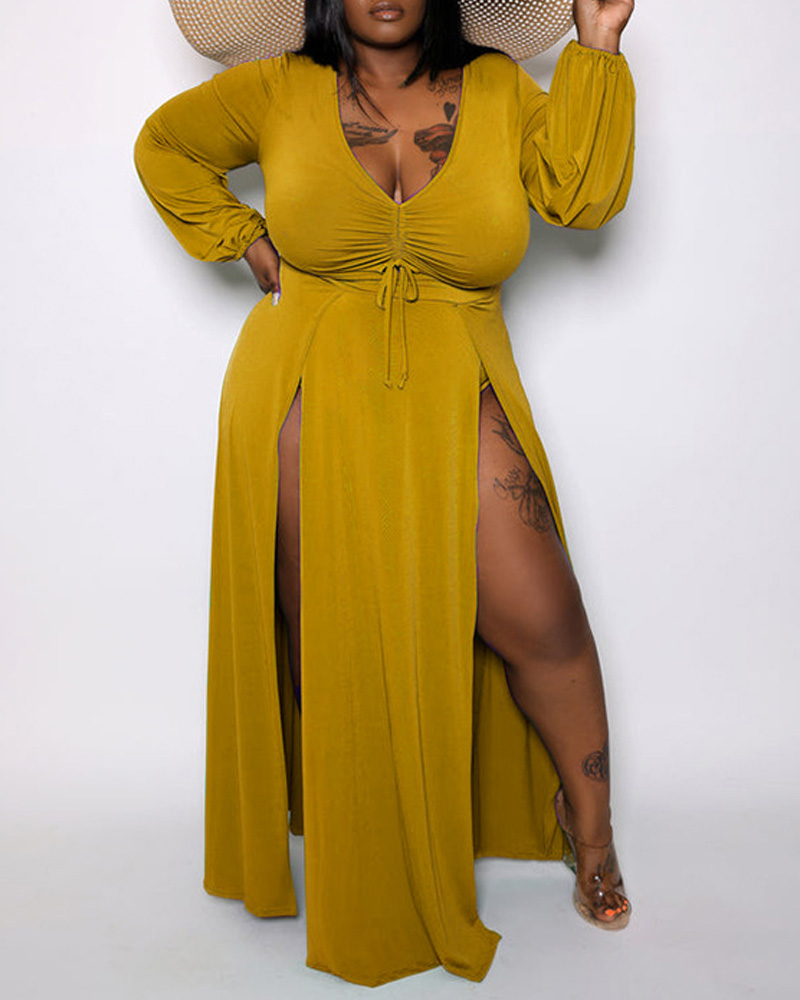 Plus Size Long Sleeve Drawstring Ruched High Slit Maxi Dress, Yellow