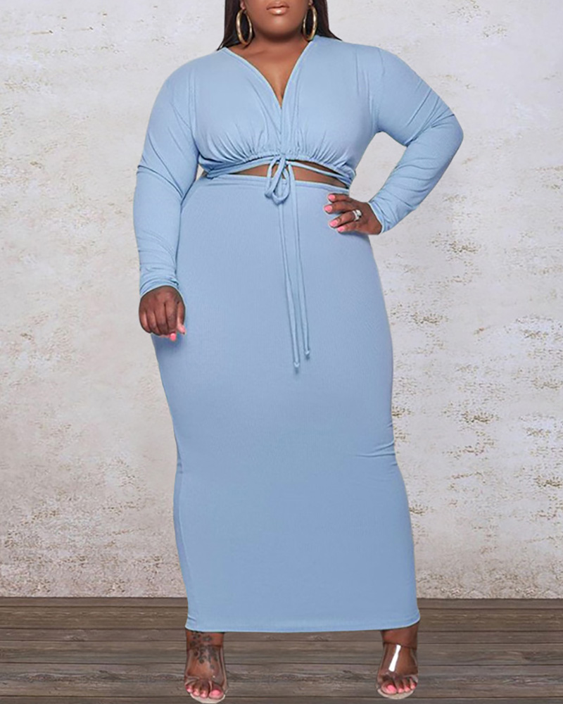 Plus Size Long Sleeve Drawstring Ruched Top & Skirt Sets, Blue