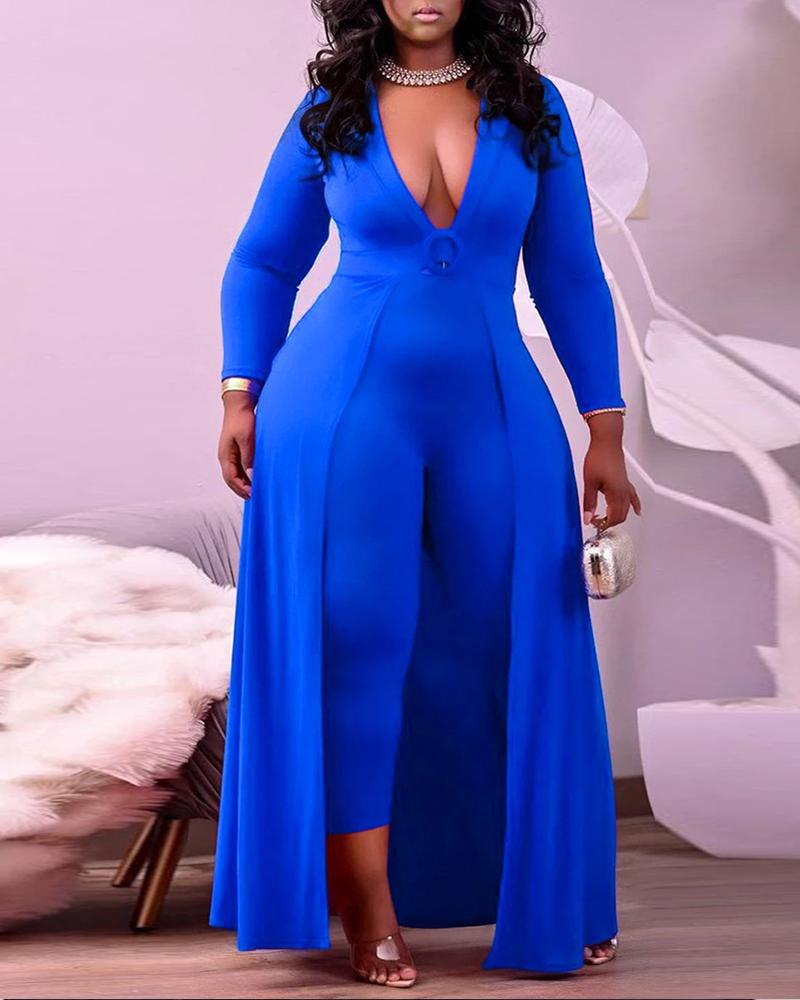 Plus Size Long Sleeve Patchwork Overlay Jumpsuit, Blue
