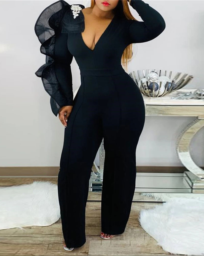 Plus Size Long Sleeve Ruffle Hem Jumpsuit, Black