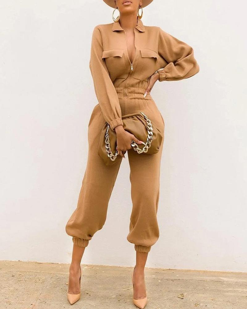 Plus Size Long Sleeve Zipper Front Cuff Jumpsuit, Apricot