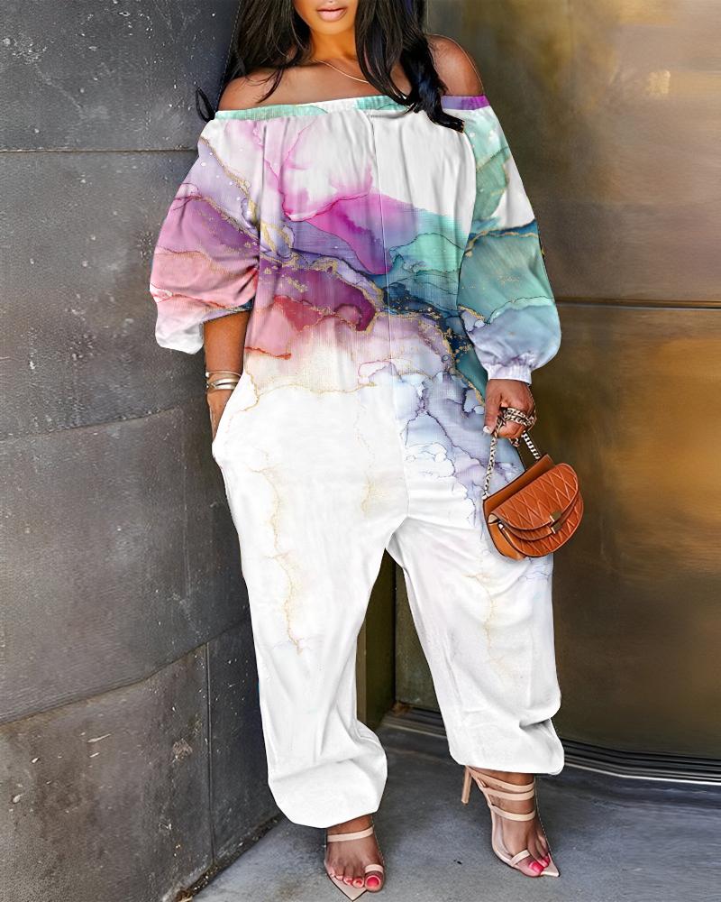 Plus Size Marble Print Off Shoulder Jumpsuit, White