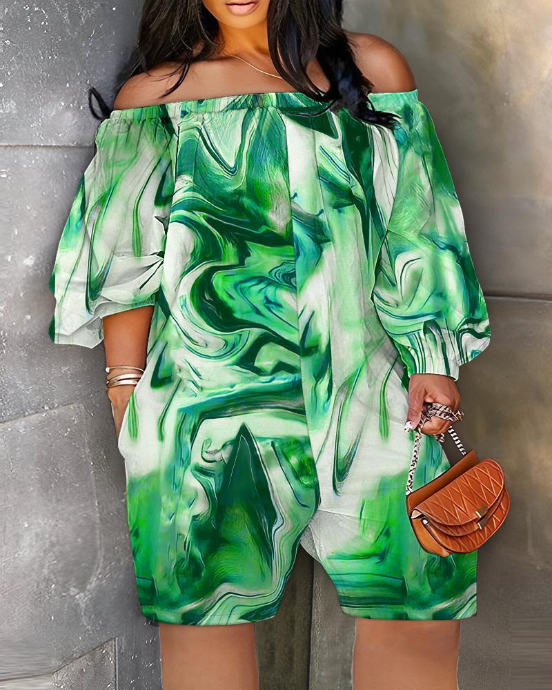 Plus Size Marble Print Off Shoulder Romper, Green