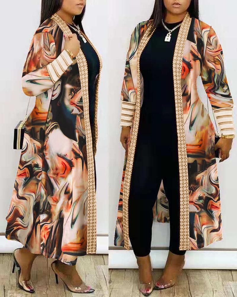 Plus Size Marble Print Open Front Longline Coat, Apricot