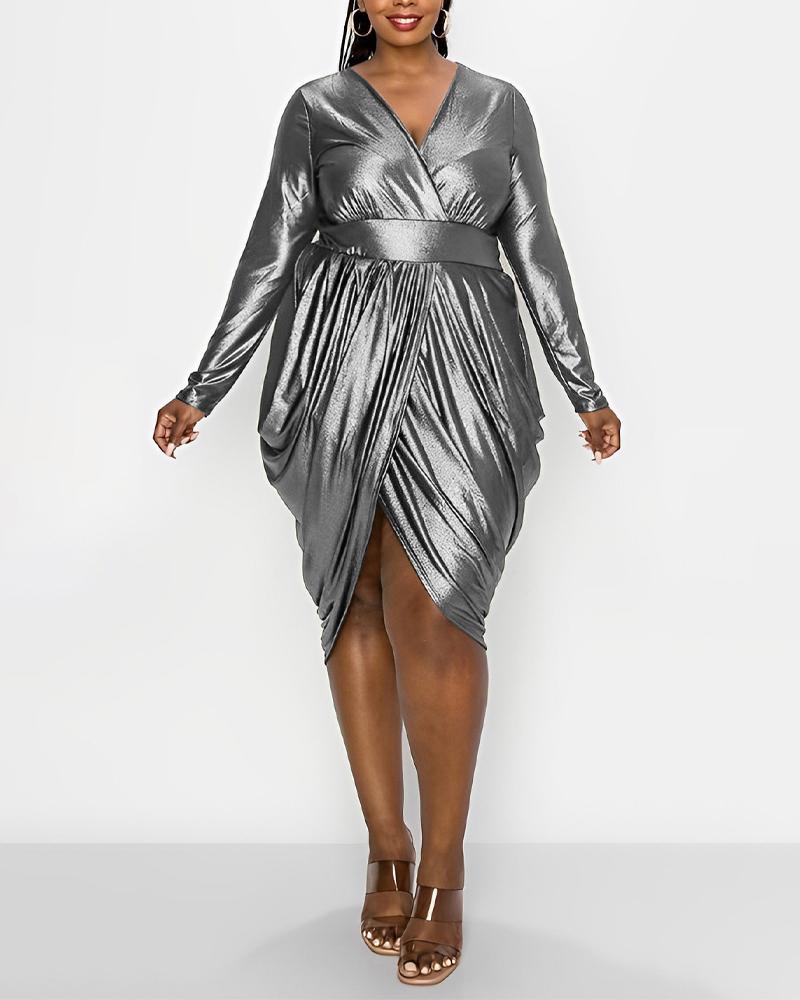 Plus Size Metallic Long Sleeve Ruched Party Dress, Silver