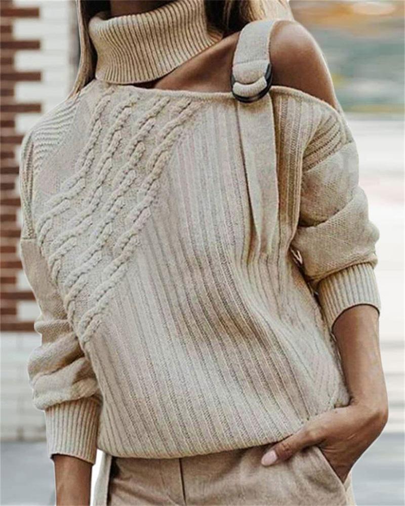 Plus Size O-Ring Cold Shoulder Cable Knit Sweater, Beige
