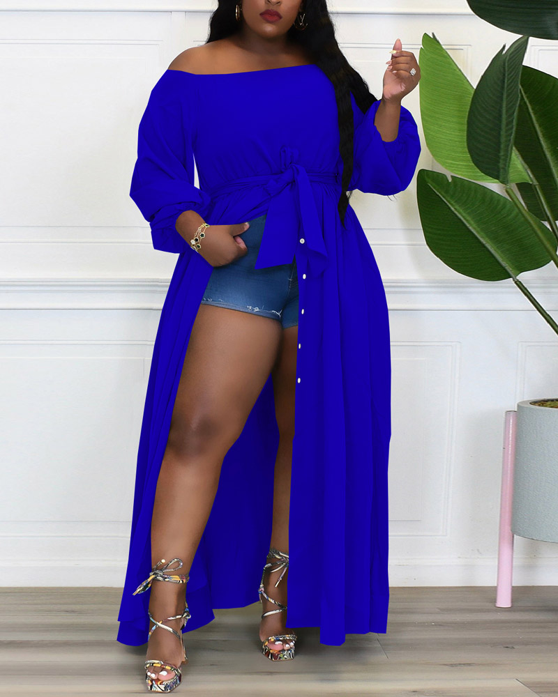 Plus Size Off Shoulder Button Front Belted Maxi Dress, Blue
