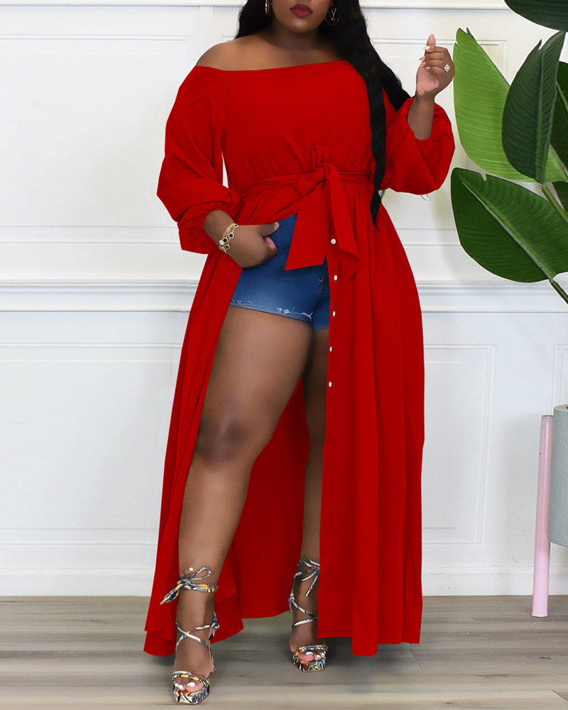 Plus Size Off Shoulder Button Front Belted Maxi Dress, Red