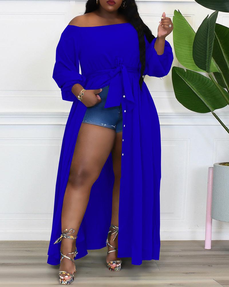 Plus Size Off Shoulder Button Front Slit Maxi Dress, Blue