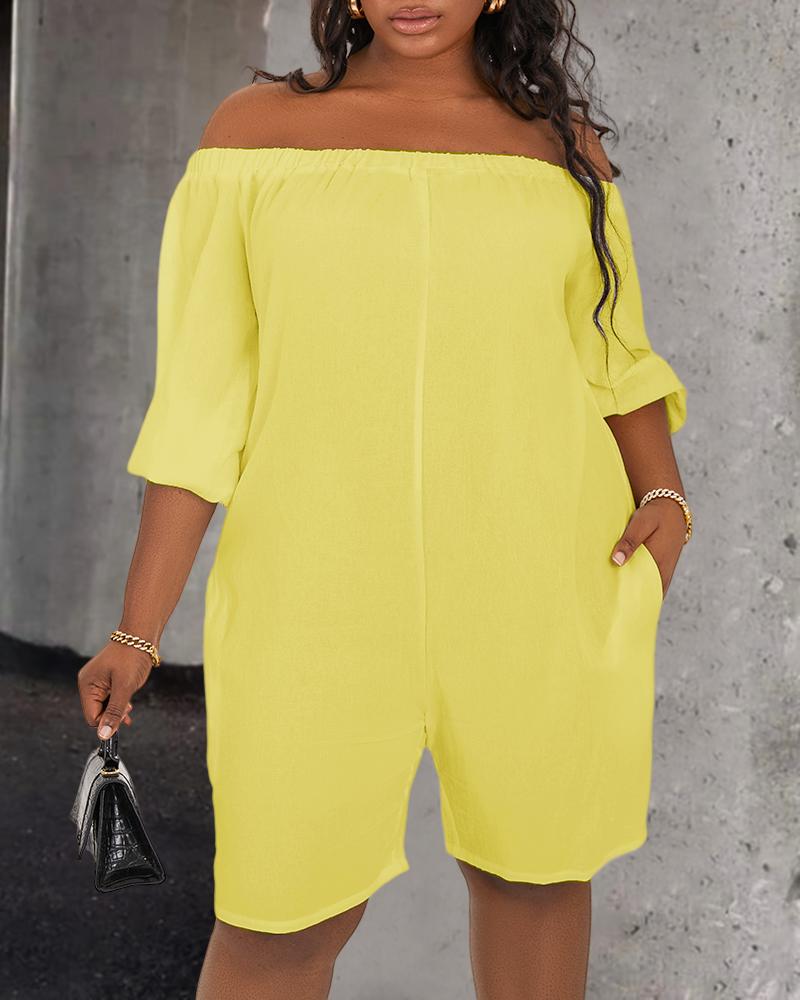 Plus Size Off Shoulder Pocket Design Casual Romper, Yellow