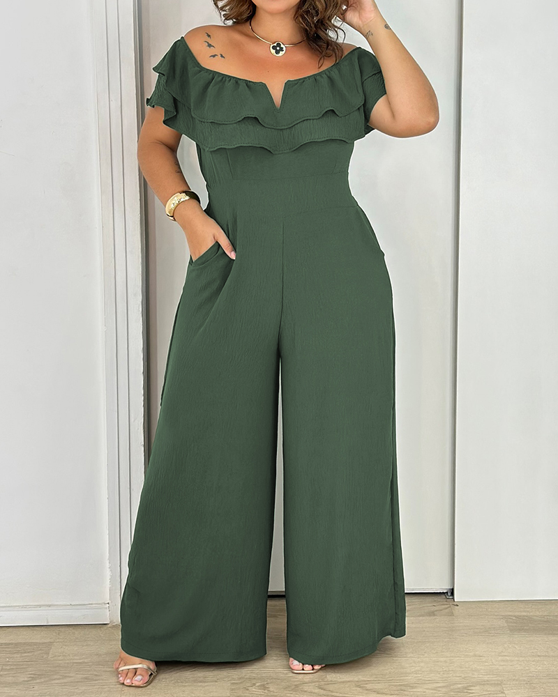 Plus Size Off the Shoulder Short Sleeve Ruffles Jumpsuit, Green