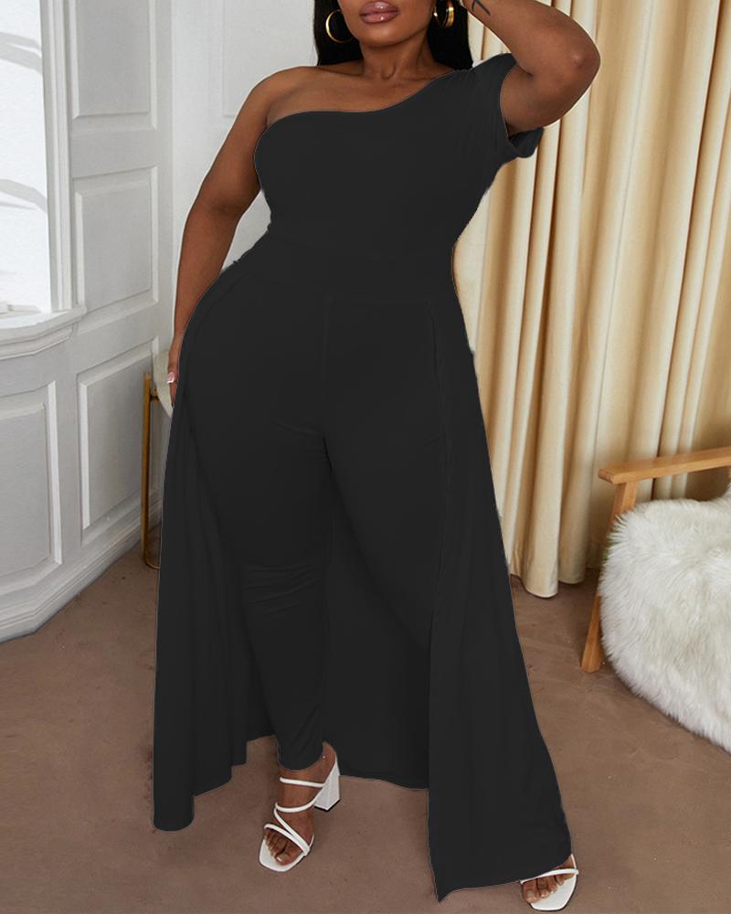 Plus Size One Shoulder Patchwork Overlay Jumpsuit, Black