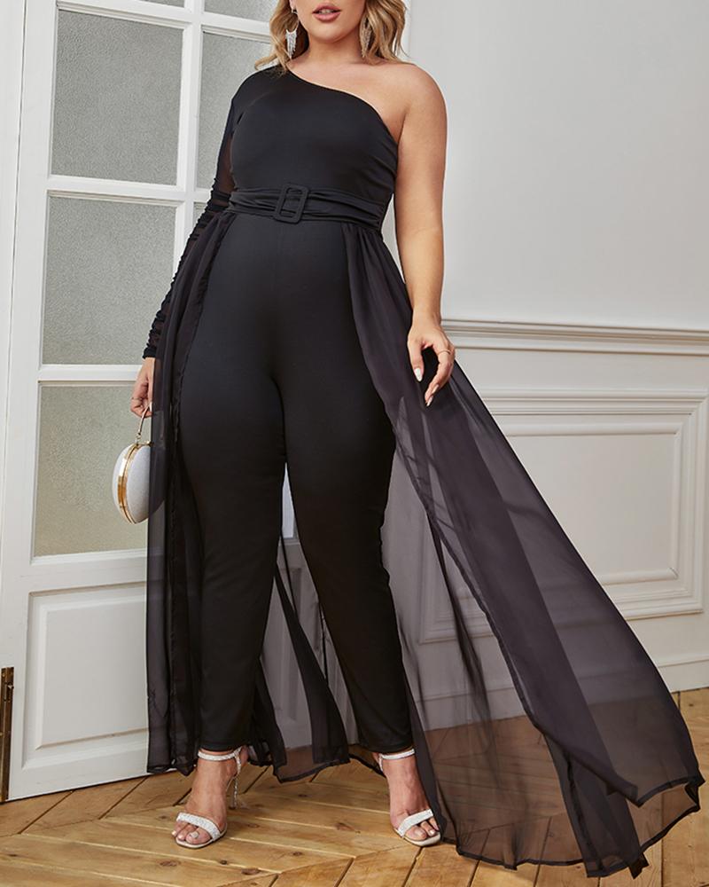 Plus Size One Shoulder Sheer Mesh Jumpsuit, Black