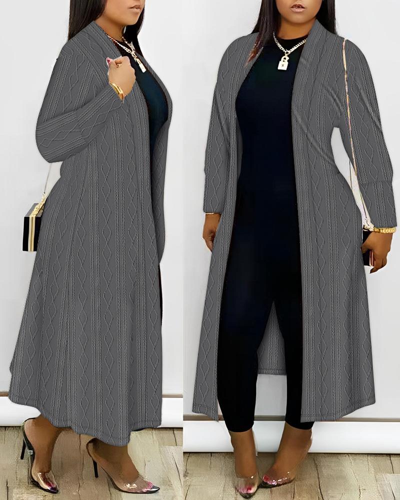 Plus Size Open Front Cable Textured Longline Coat, Gray