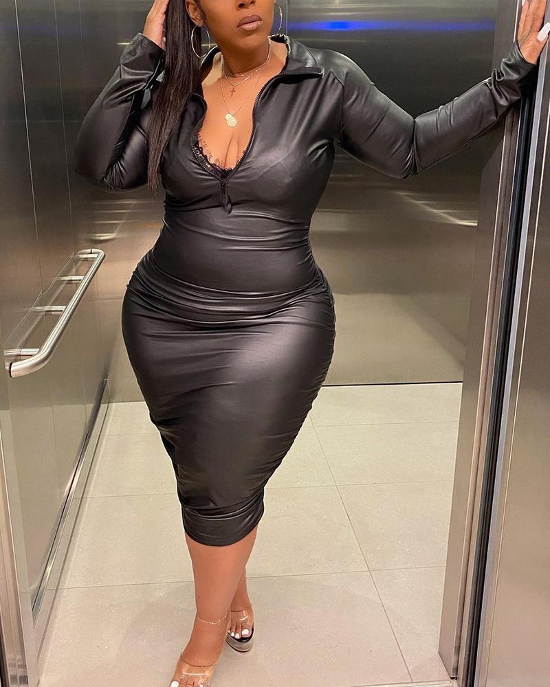 Plus Size PU Collared Zipper Front Ruched Midi Dress, Black