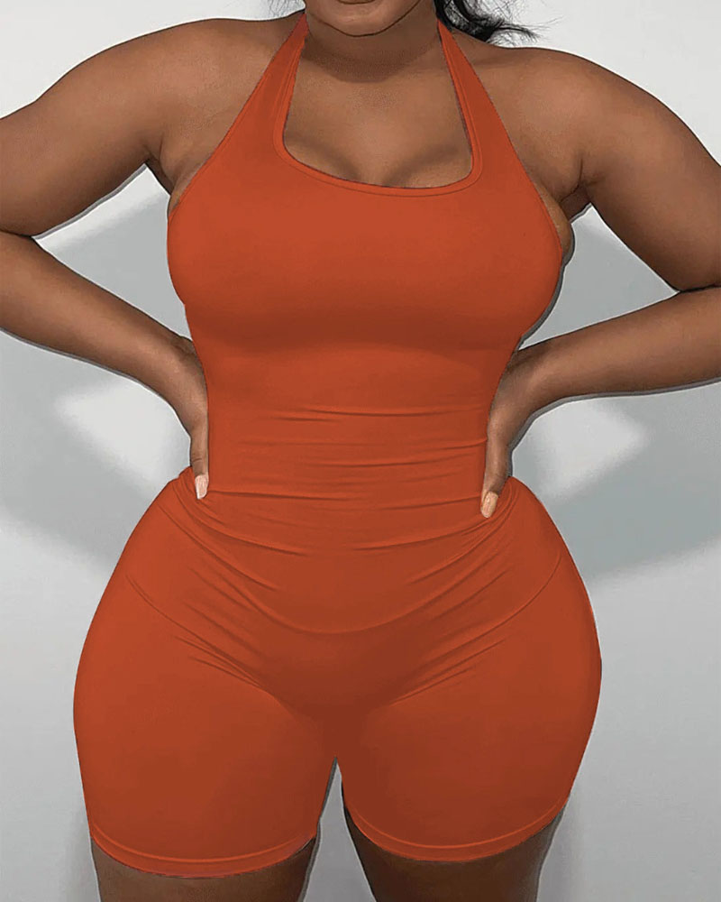 Plus Size Plain Halter Backless Skinny Romper, Orange