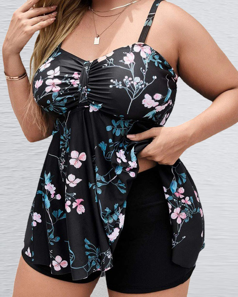Plus Size Plants Print Ruched Bust Tankini Set, Black