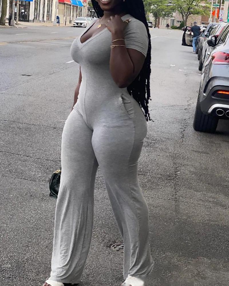 Plus Size Pocket Design Short Sleeve Jumpsuit, Gray