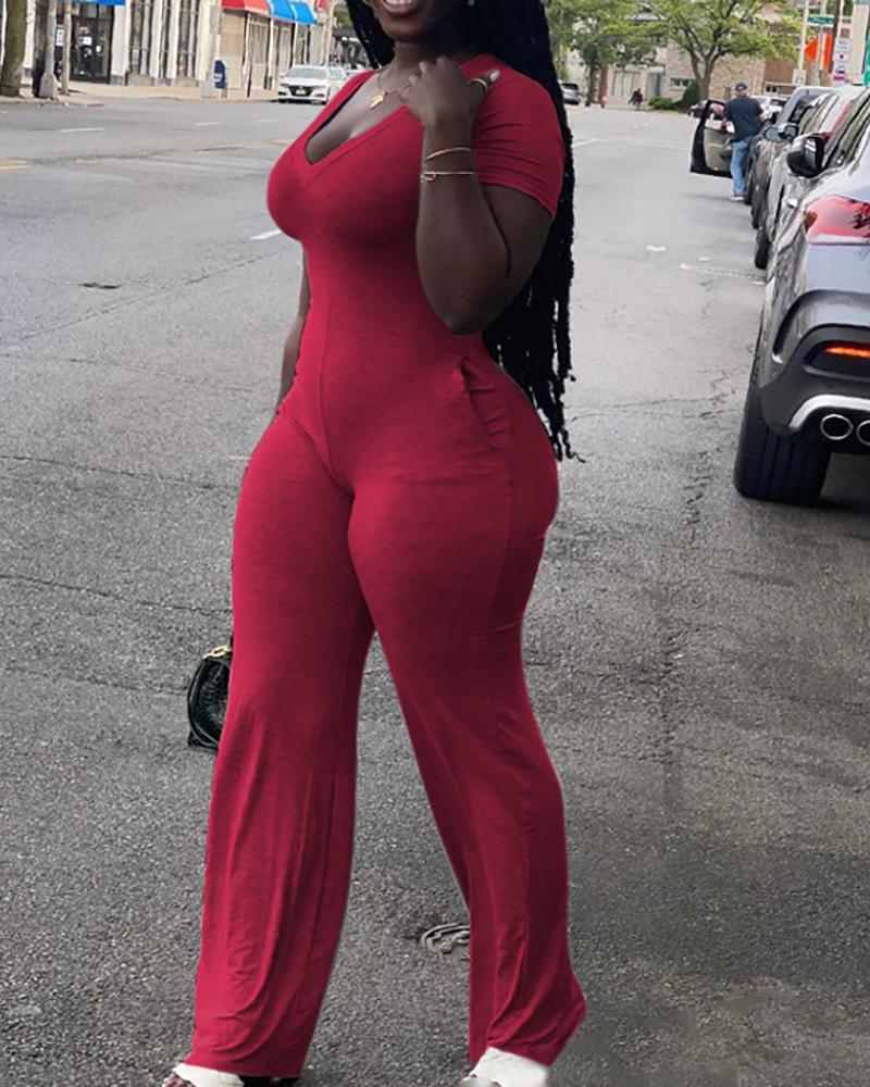 Plus Size Pocket Design Short Sleeve Jumpsuit, Red