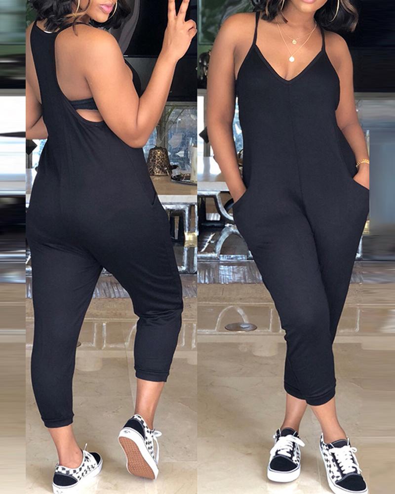 Plus Size Pocket Design Spaghetti Strap Jumpsuit, Black