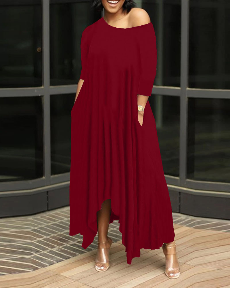 Plus Size Pocket Detail Asymmetrical Maxi Dress, Wine red