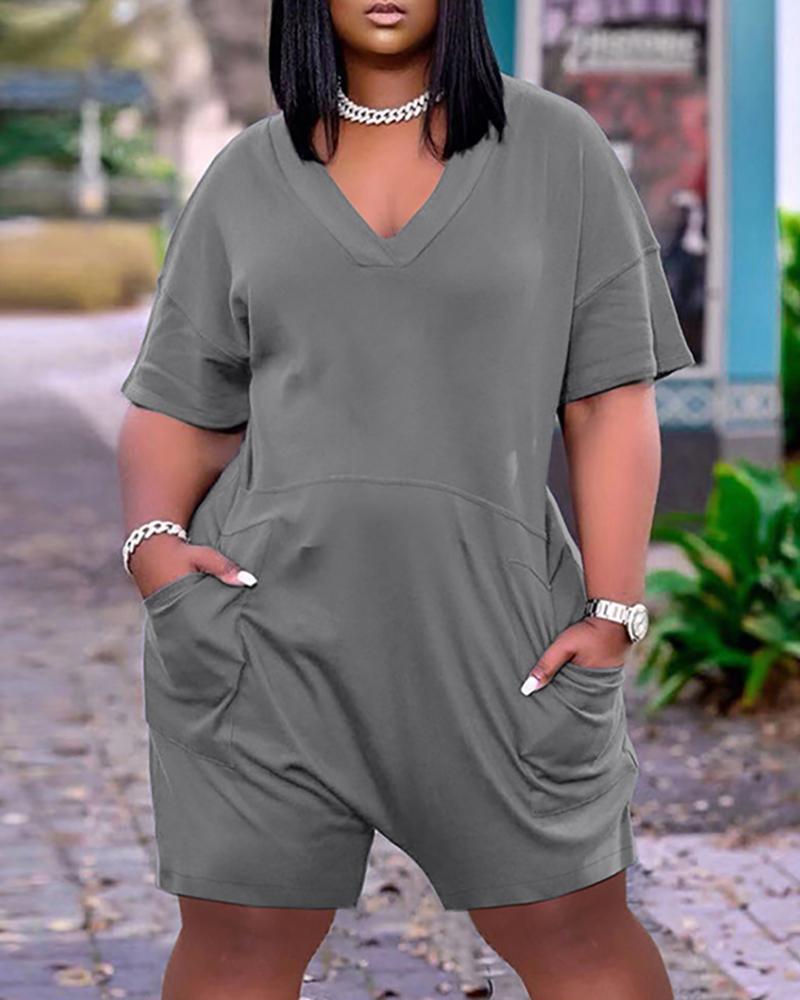 Plus Size Pocket Detail Short Sleeve Romper, Gray