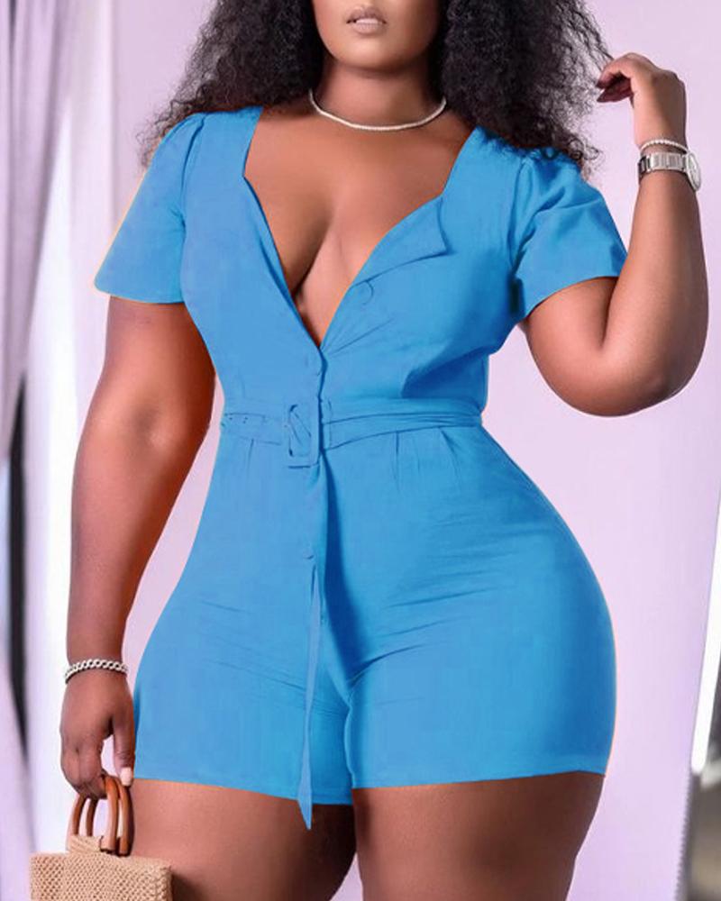 Plus Size Puff Sleeve Button Front Belted Romper, Blue