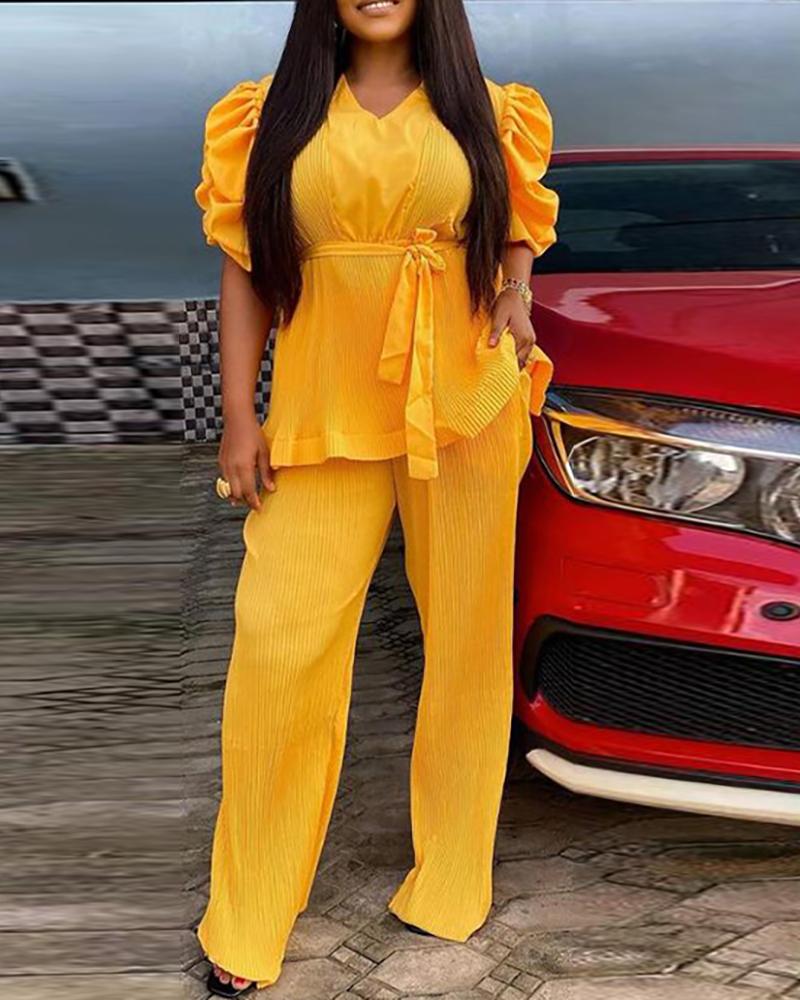 Plus Size Puffed Sleeve Ruffles Hem Top & Pants Set, Yellow