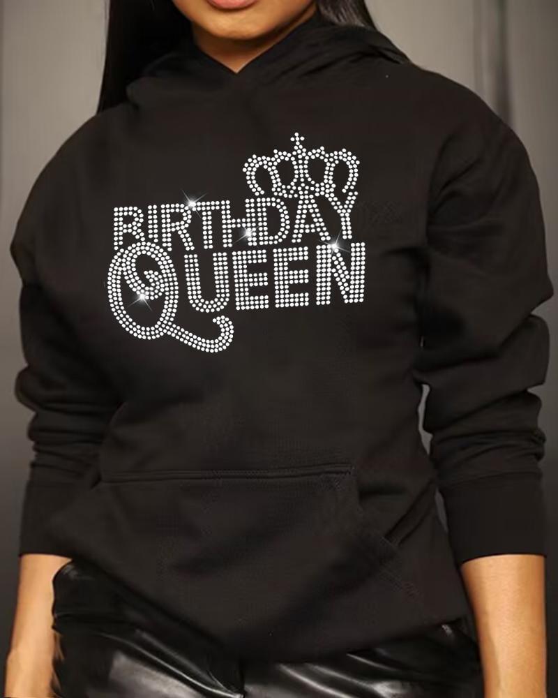 Plus Size Rhinestone Birthday Queen Crown Pattern Hoodie, Black