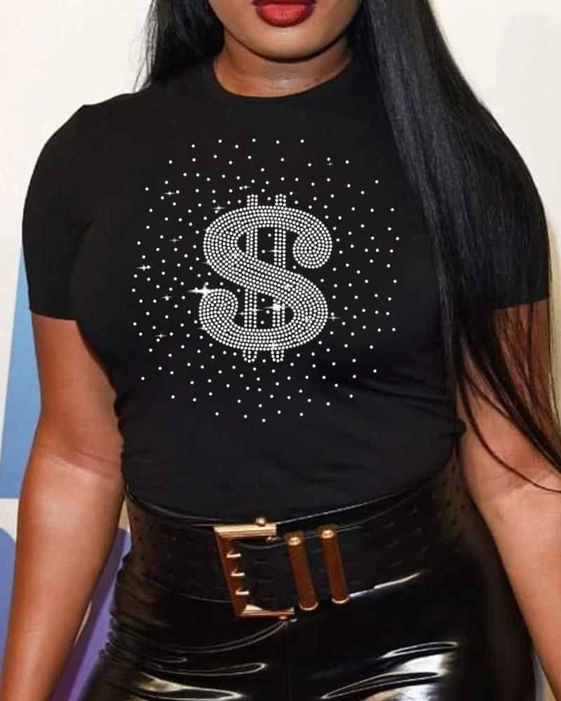 Plus Size Rhinestone Dollar Pattern Casual T-shirt, Black