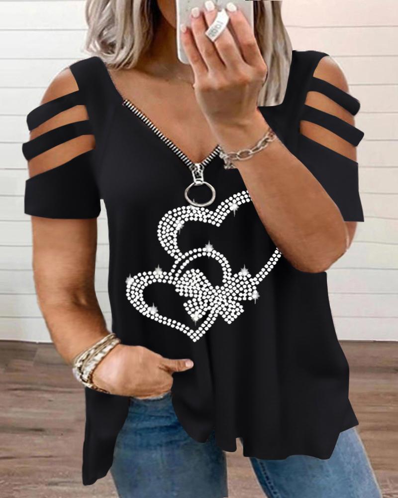 Plus Size Rhinestone Double Heart Bowknot Pattern Zipper Design T-Shirt, Black