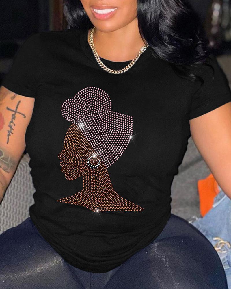 Plus Size Rhinestone Figure Pattern Casual T-shirt, Black
