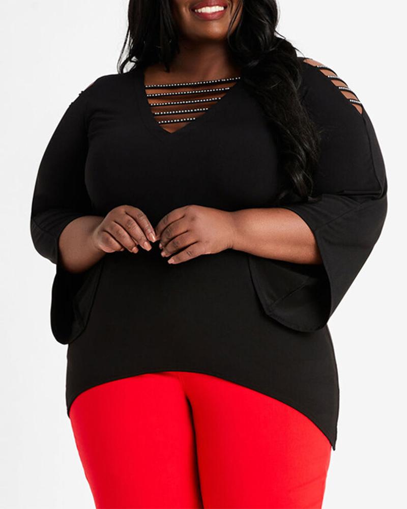 Plus Size Rhinestone Ladder Cutout Cold Shoulder Top, Black