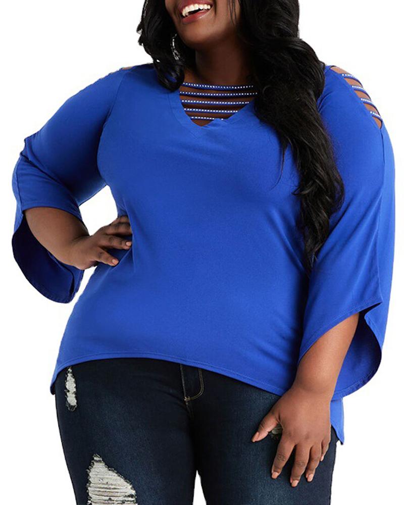Plus Size Rhinestone Ladder Cutout Cold Shoulder Top, Blue