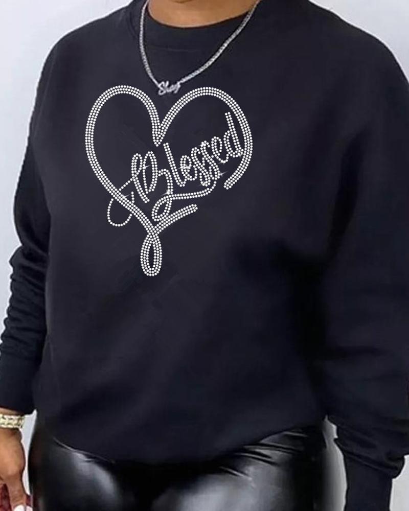 Plus Size Rhinestone Letter Heart Pattern Sweatshirt, Black