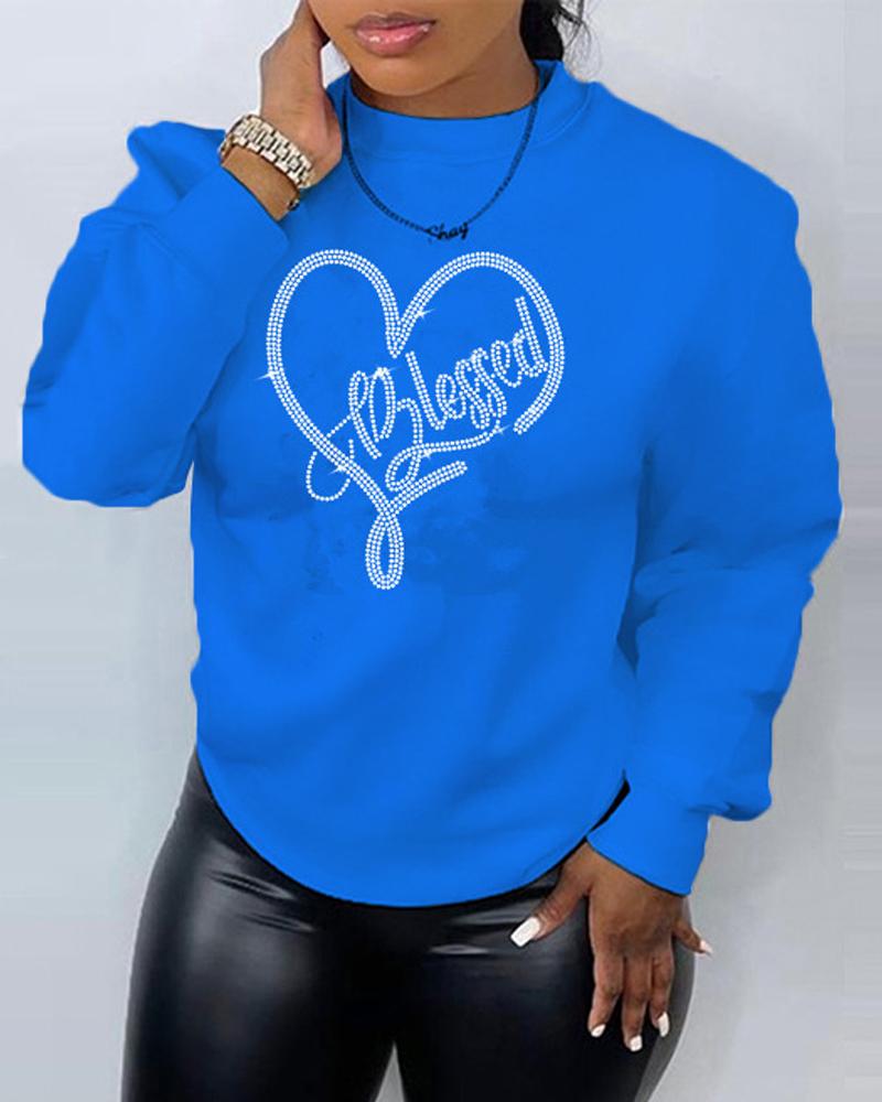 Plus Size Rhinestone Letter Heart Pattern Sweatshirt, Blue