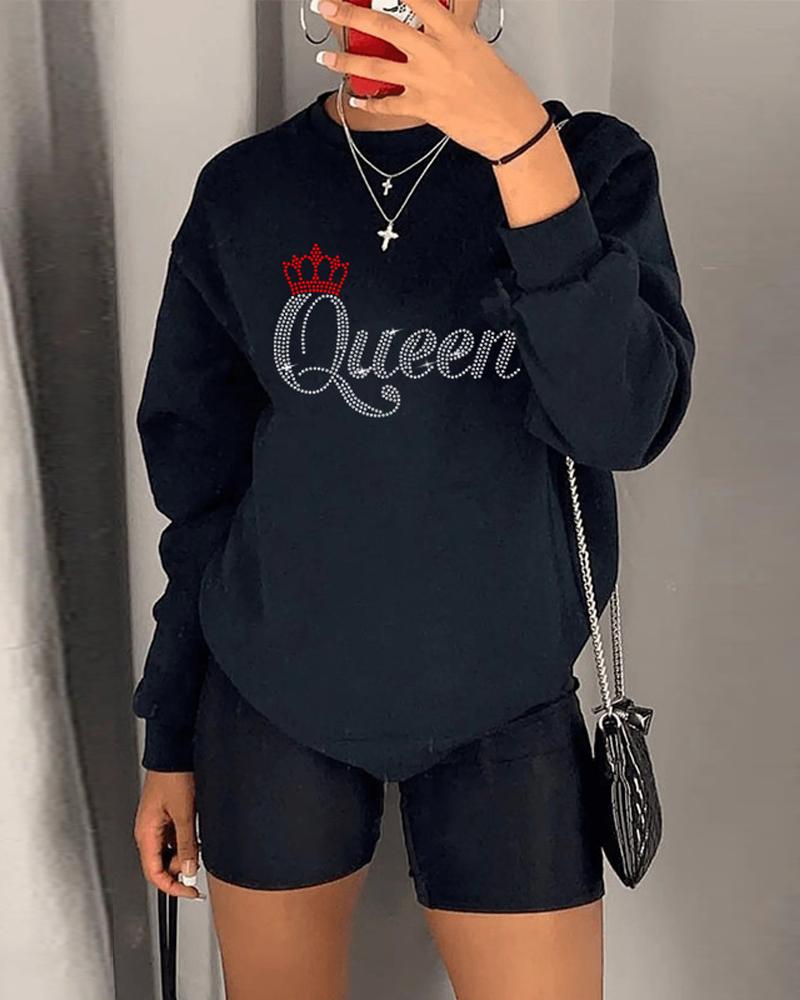 Plus Size Rhinestone Letter Pattern Casual Sweatshirt, Black