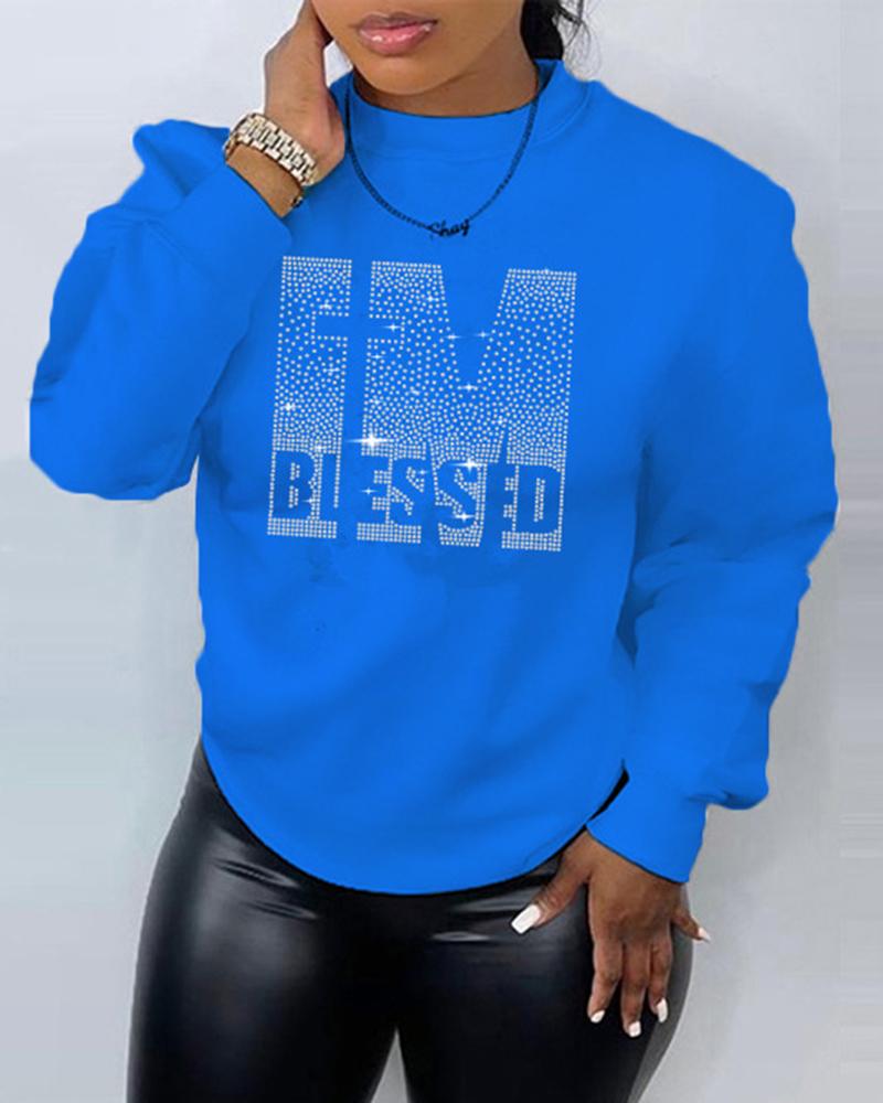 Plus Size Rhinestone Letter Pattern Long Sleeve Sweatshirt, Blue