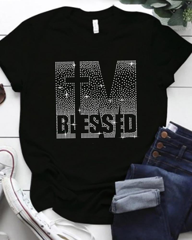 Plus Size Rhinestone Letter Pattern Short Sleeve T-shirt, Black