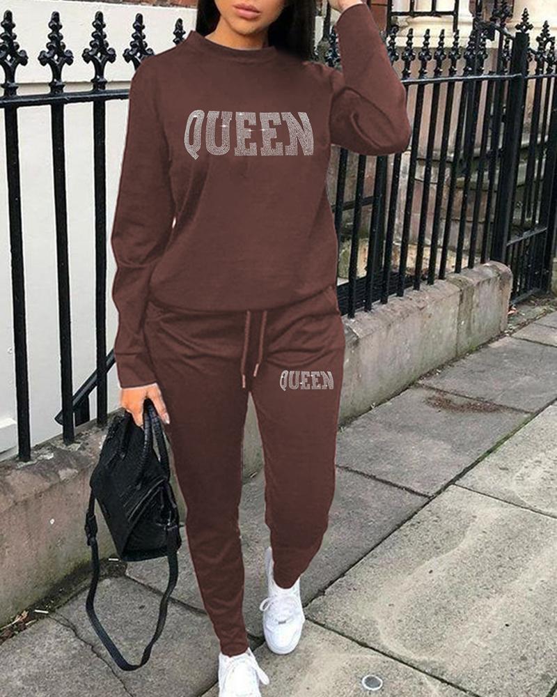 Plus Size Rhinestone Letter Pattern Sweatshirt & Drawstring Pants Set, Brown