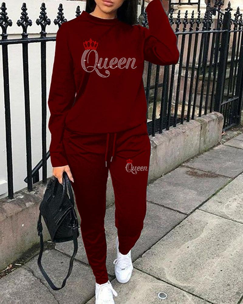 Plus Size Rhinestone Letter Pattern Sweatshirt & Drawstring Pants Set, Wine red